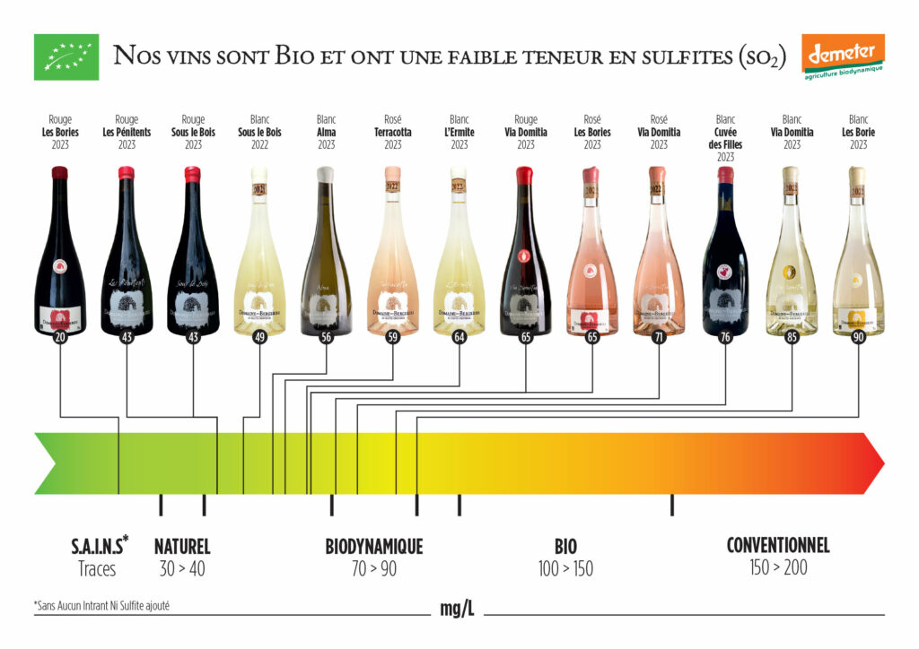 Ce sont des vins qui contiennent moins de sulfites que ce qui est autorisé par Demeter (biodynamie). Enfin, de par l’histoire du Domaine, mais aussi par conviction, certaines cuvées sont élevées en amphores de 750L. venues, elles aussi, d’Italie….